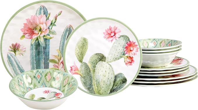 • O adorável cacto florido é apresentado no programa "Desert Beauty" da Certified International, 12 peças. Conjunto de louça, projetado pelo artista Danhui Nai. Feito de 100% melamina durável e pesada, este conjunto inclui 4 a 3 peças. configurações de lugar, uma adição muito especial à sua mesa de jantar interna ou externa. Peça a louça de melamina correspondente para completar o visual do belo deserto em sua casa.